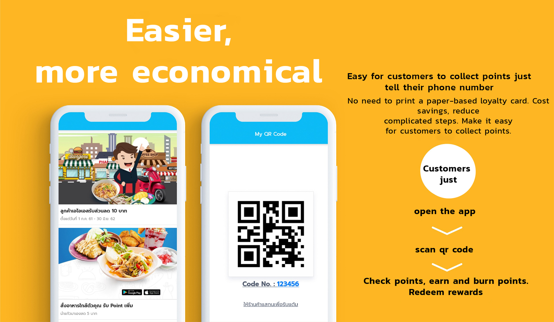 ไม่ต้องพิมพ์บัตรสะสมแต้มแบบกระดาษ ประหยัดค่าใช้จ่าย ลดขั้นตอนที่ยุ่งยาก ให้ลูกค้าสะสมแต้มได้ง่าย ๆ เพียงสแกน QR Code เพื่อรับแต้ม > เช็คแต้ม หรือแลกของรางวัล
