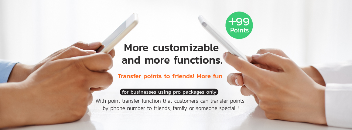 สำหรับธุรกิจที่ใช้งานแพ็กเกจโปร สามารถให้ลูกค้าของธุรกิจคุณสนุกกับการใช้เทคโนโลยีได้มากกว่า ด้วยระบบการโอนแต้ม ที่ลูกค้าสามารถโอนแต้มด้วยเบอร์โทรให้กับ เพื่อน ครอบครัว หรือคนพิเศษได้